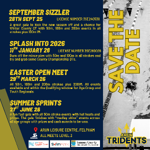 Arun Tridents was formally recognised in December 2022 following the merger of two great local clubs, Littlehampton Swimming Club (founded in 1983) and Bognor Swimming Club (founded in 1965).